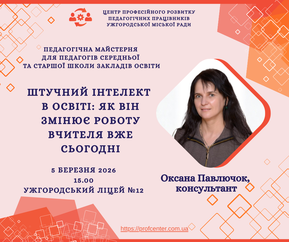 5 березня 2026 року в Ужгородському ліцеї №12 відбулася педагогічна майстерня «Штучний інтелект в освіті: як він змінює роботу вчителя вже сьогодні», організована Центром професійного розвитку педагогічних працівників м. Ужгород.